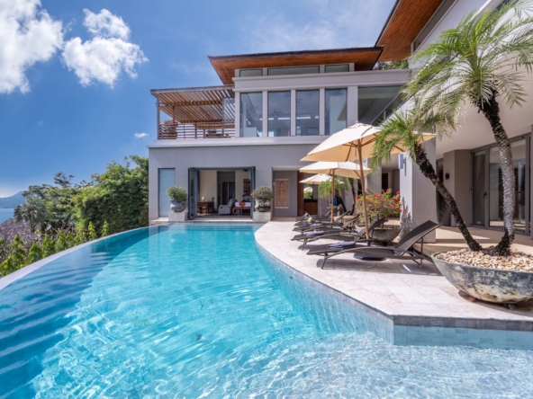 Designed to maximize its stunning location, this modern two-level home features strong horizontal lines that offer uninterrupted panoramic views from every spacious room. The grand entrance leads into a light-filled living room, where sunlight pours in through the glass facade, which can be opened to invite the soothing ocean breeze. A plush oversized sofa provides a perfect spot to gaze at the onyx-tiled reflecting pond, which seamlessly flows into Naka Lay Bay and the shimmering Andaman Sea.