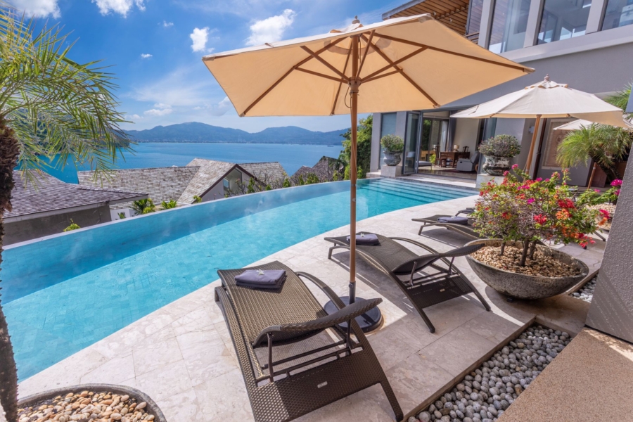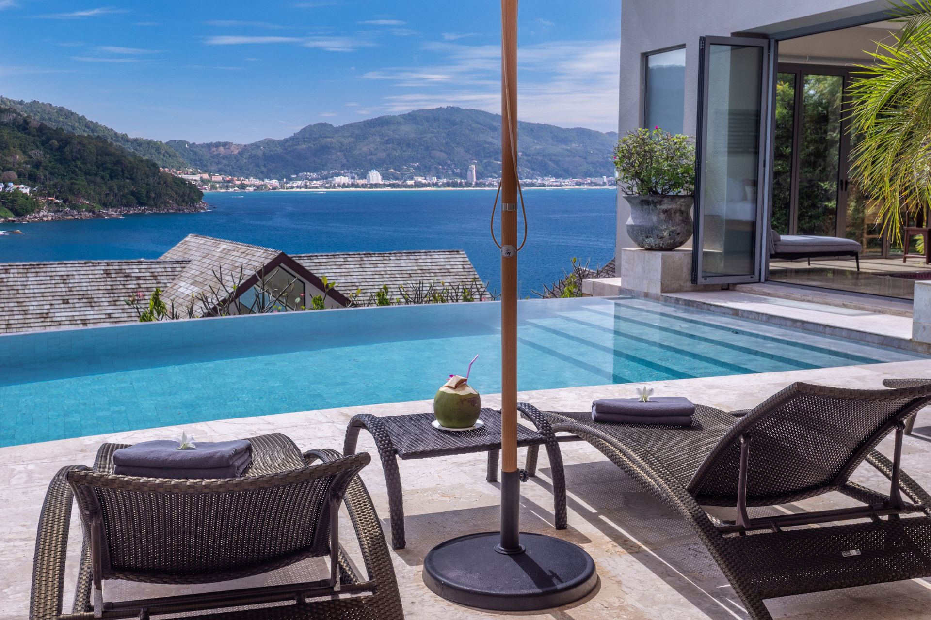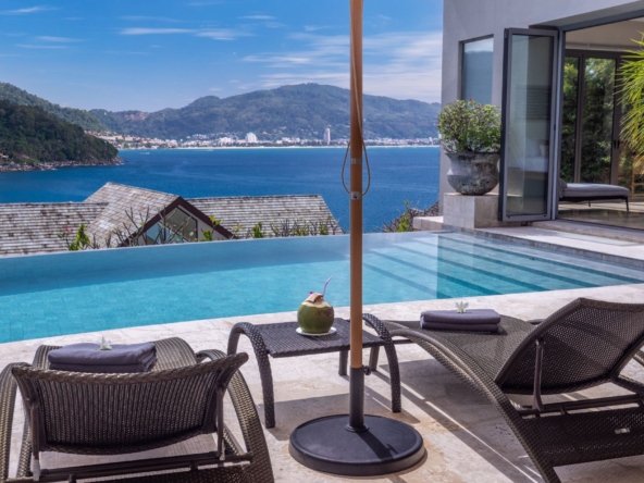 Outside, the impressive 18-meter infinity pool offers breathtaking views of Nakalay Bay and the Patong skyline. The pool features a shallow end, perfect for children or those looking for a quick dip. Sun loungers and umbrellas provide a comfortable space for guests to relax throughout the day.