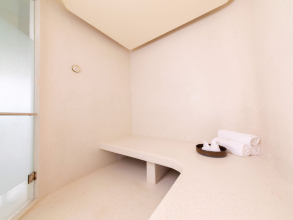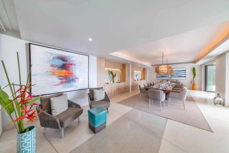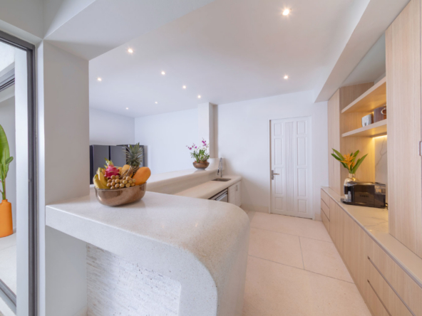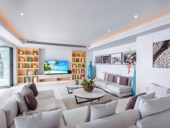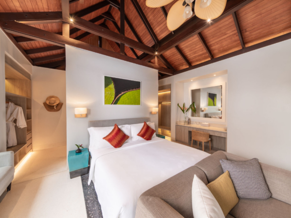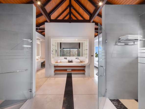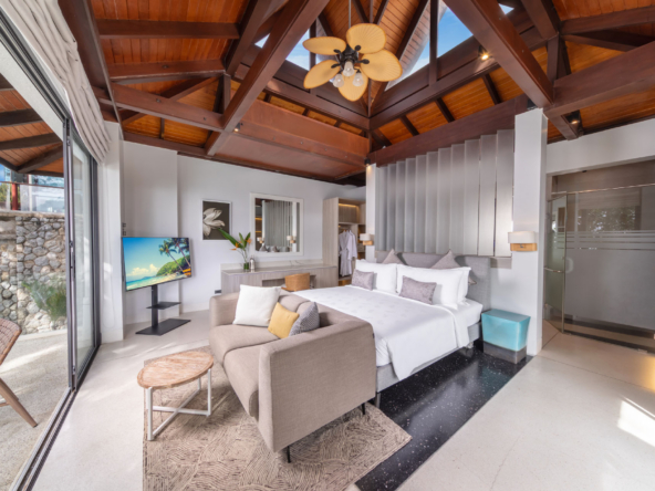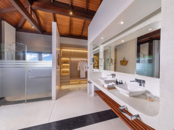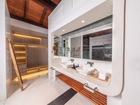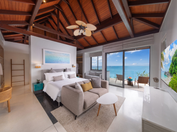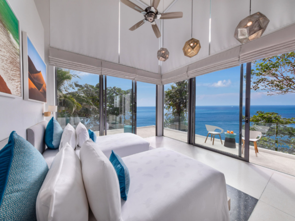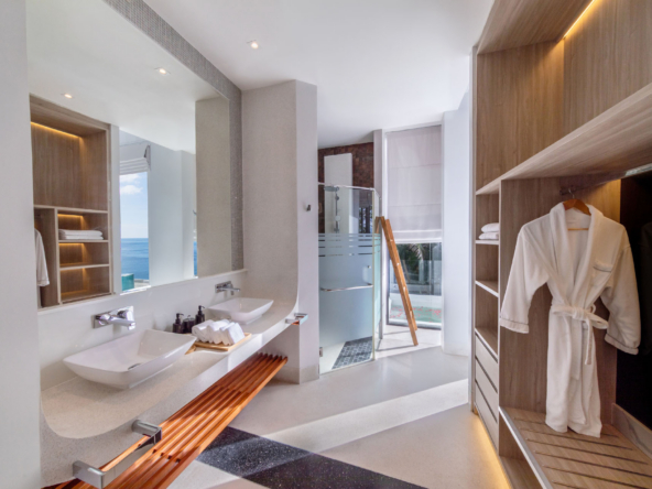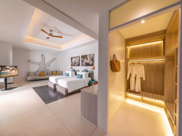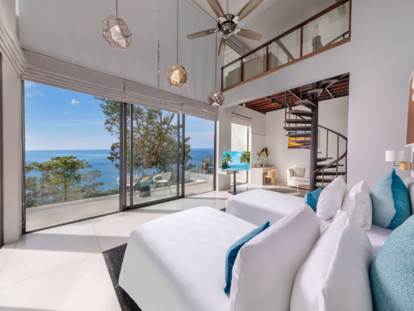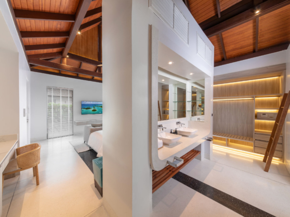 Inside, the serene seaside design unfolds with neutral-toned furnishings, white walls, and blue accents. Each of the villa’s bedrooms includes an ensuite bathroom and is equipped with king-size beds, work desks, Smart TVs, minibars, and a selection of luxury amenities. One of the bedrooms even boasts a loft-style design with a king-size bed that can be converted into two singles.