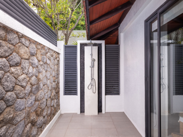 The villa’s exterior features exquisite Thai architecture, highlighted by a distinctive steeply sloping tile roof that curves elegantly. As guests approach the entrance, they are greeted by a vibrant array of green plants and foliage, offering a glimpse of the villa’s enchanting interior.