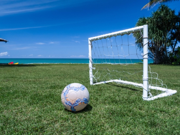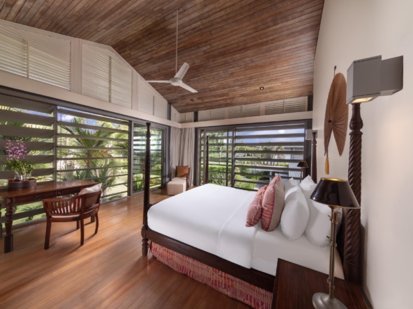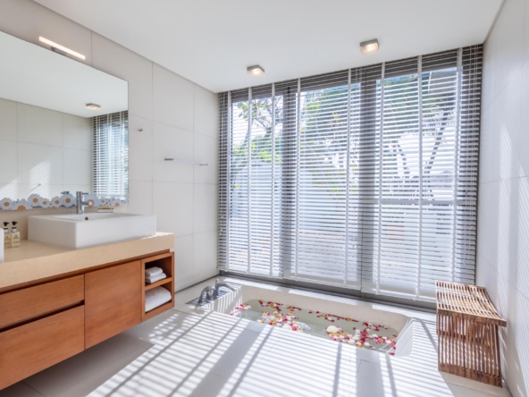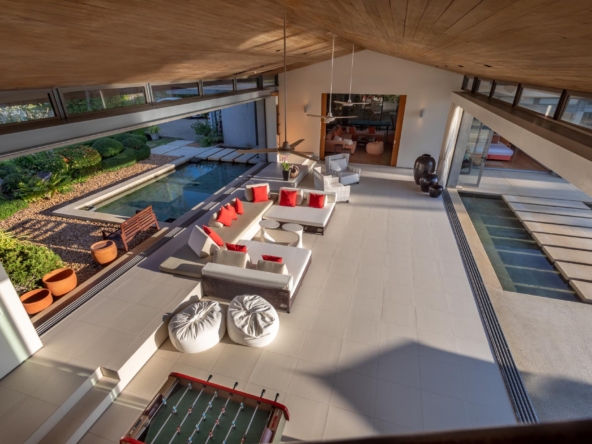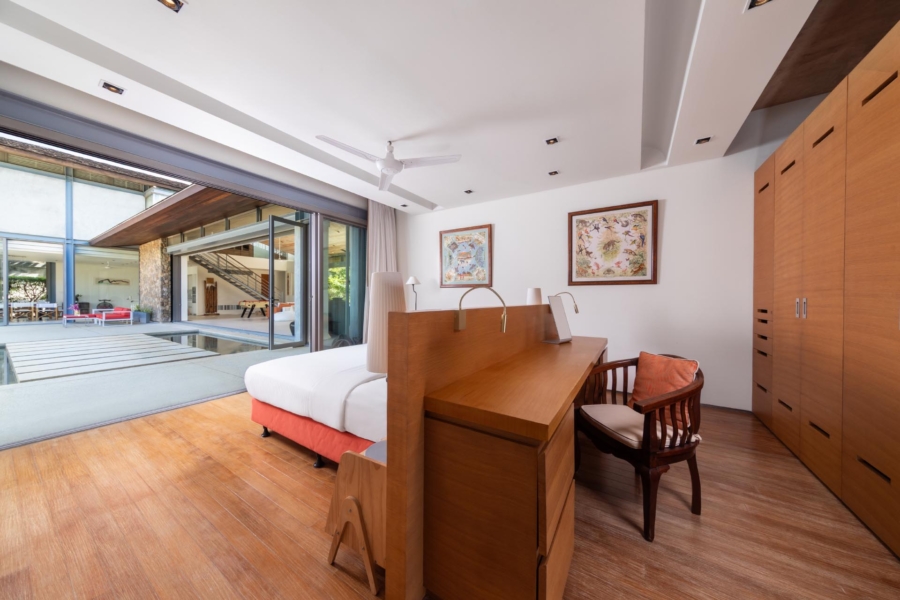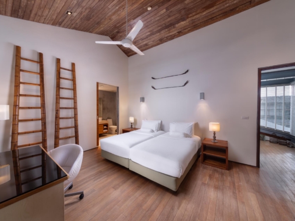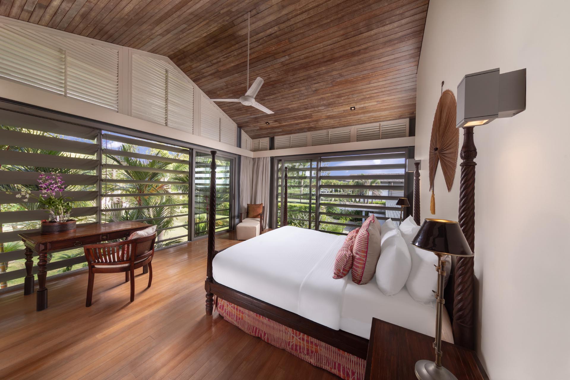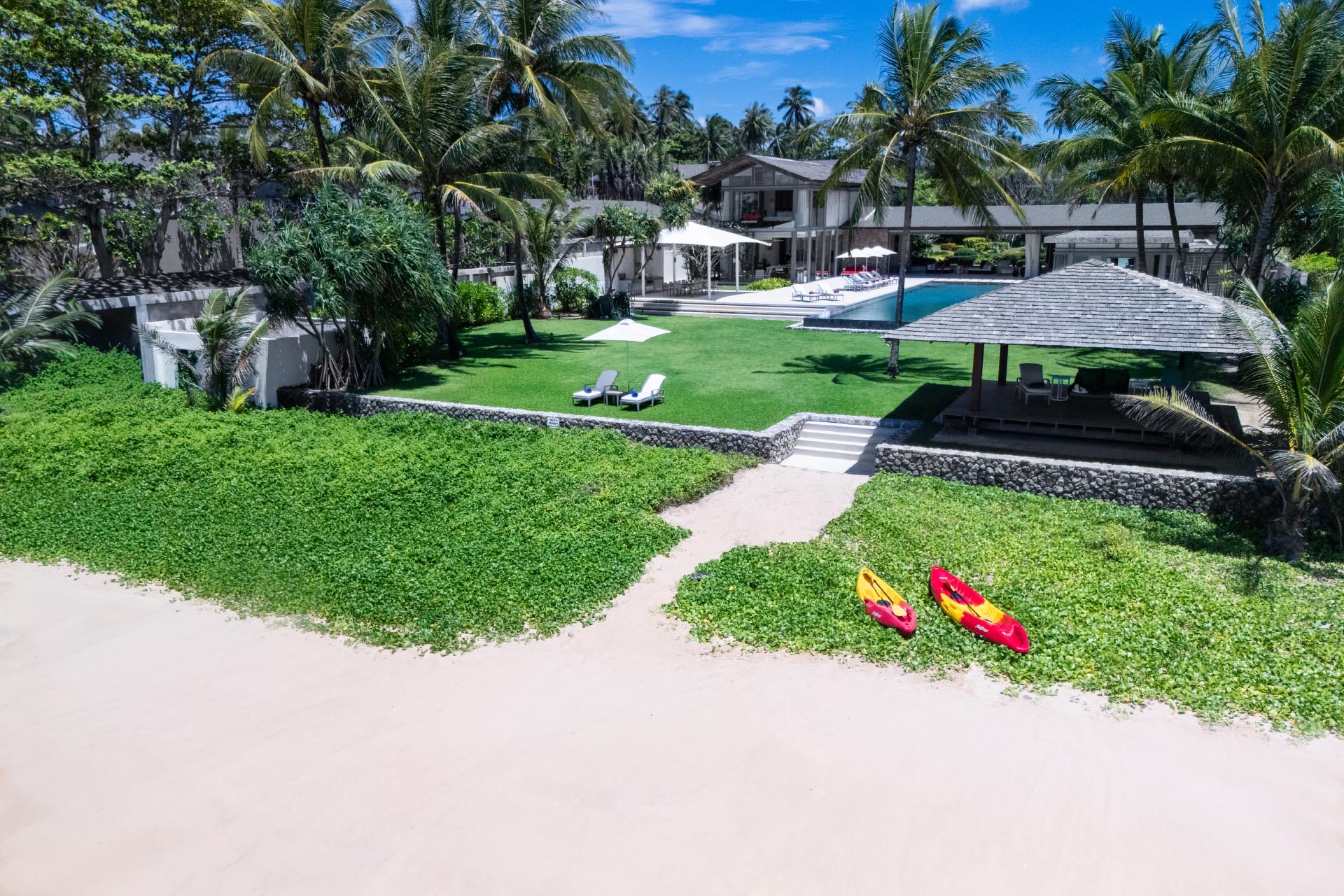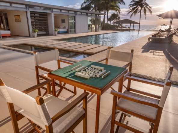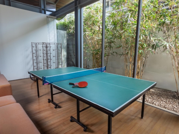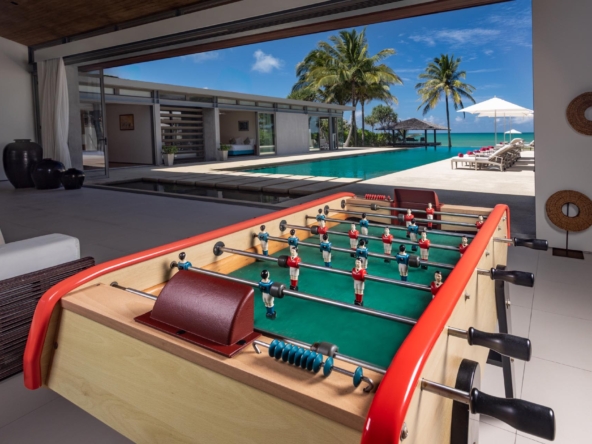 A family room with a Smart TV allows for intimate movie nights with loved ones, while the outdoor lawn of the villa becomes an ideal setting for a few rounds of petanque or badminton. Foosball and ping-pong tables are also available at the villa for one-on-one gaming action, while access to the beach and complimentary use of kayaks and paddleboards allow guests to take their adventures further into the water.