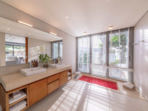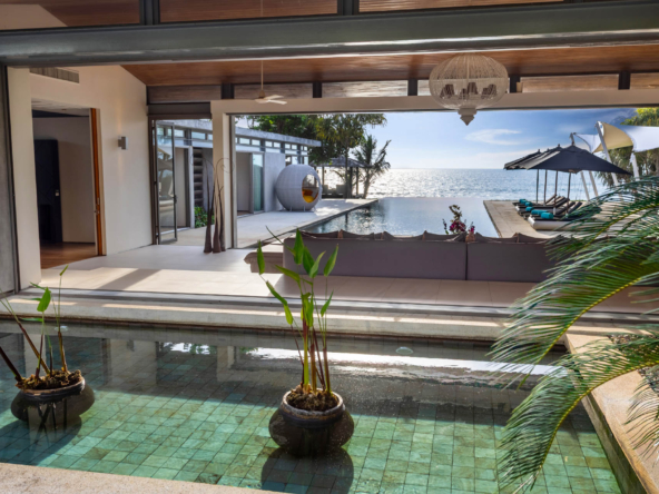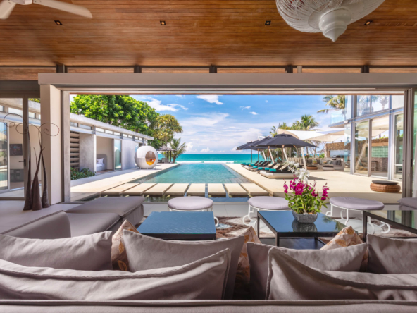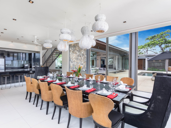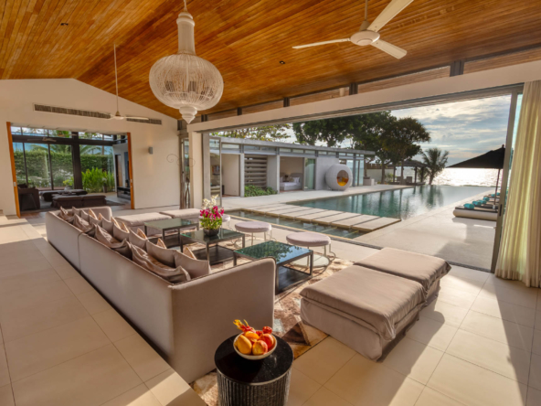Every inch of this expansive villa exudes sophistication, from its modern design and plush furnishings to the carefully curated lighting and aesthetic touches that create an atmosphere of refined elegance. The open-plan living and dining areas allow for an effortless flow between the indoors and the outdoors, with plush seating arrangements that offer sweeping views of the infinity pool and the ocean beyond. The indoor spaces are framed by floor-to-ceiling windows that bring the outside in.