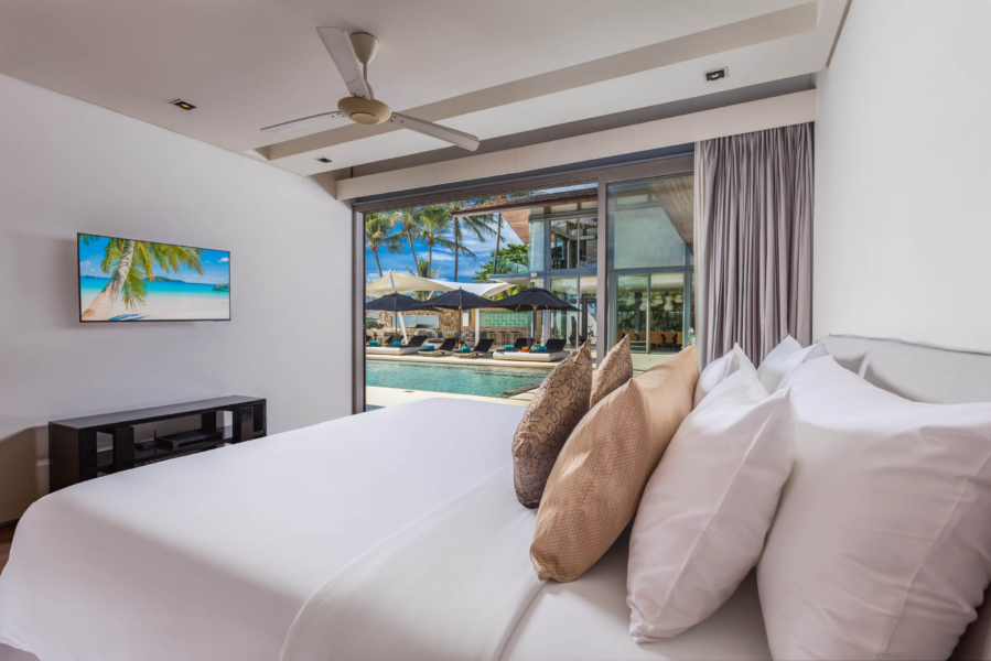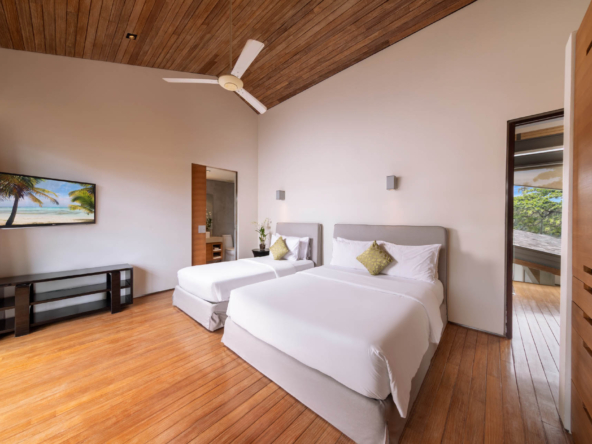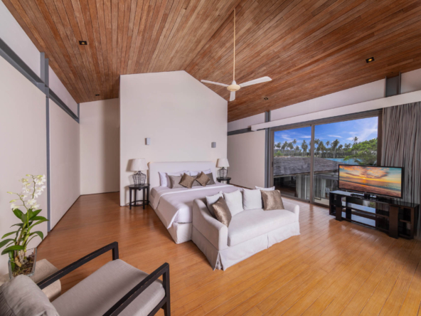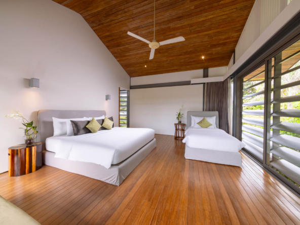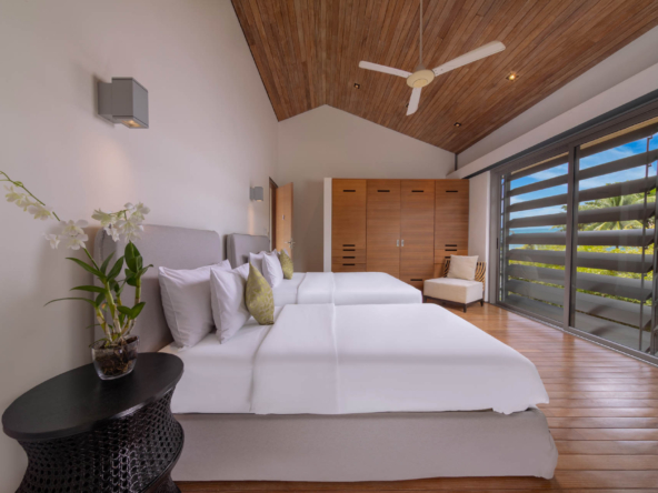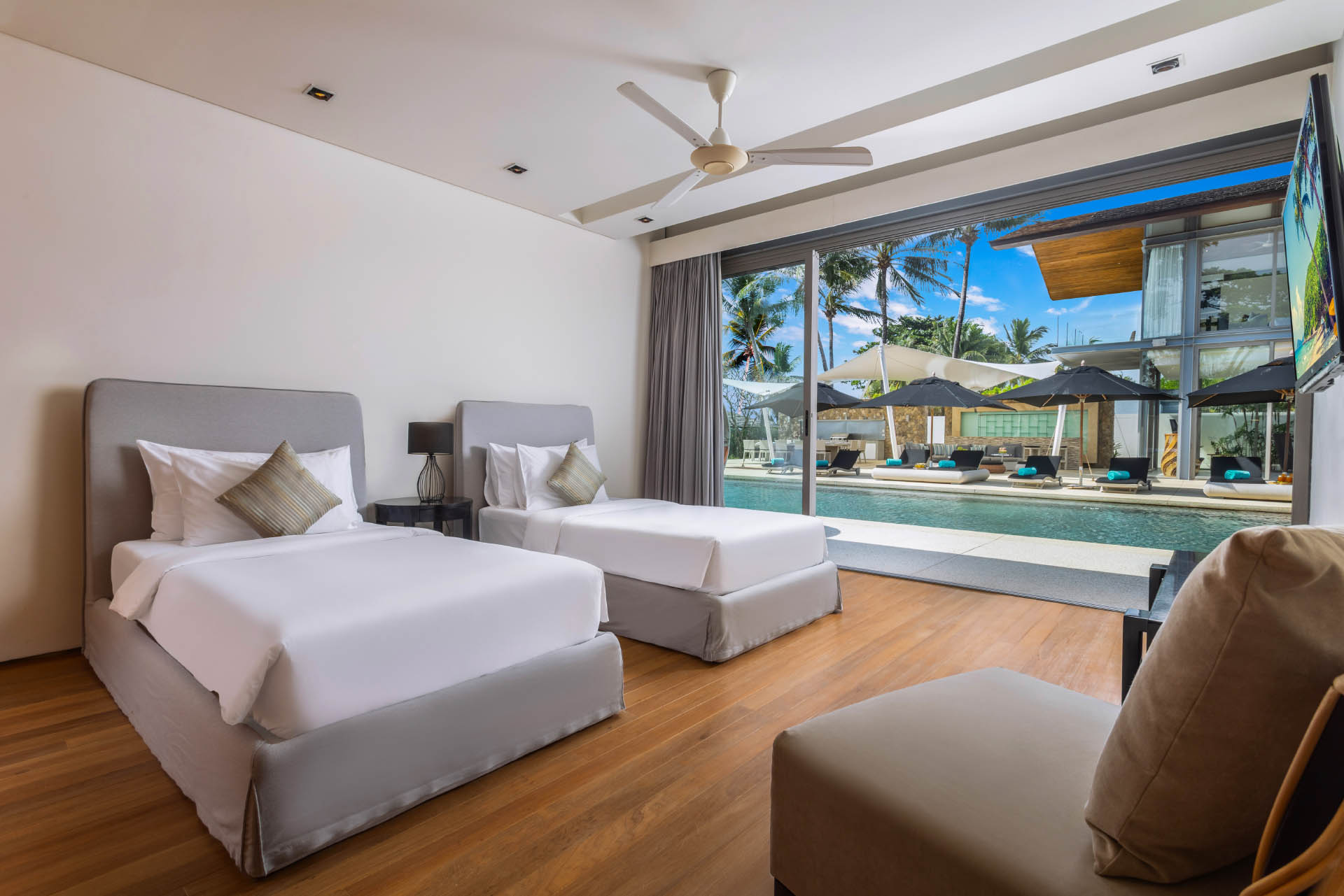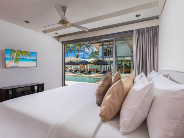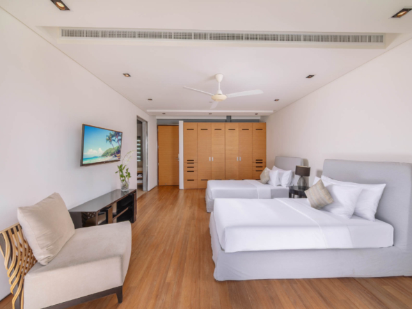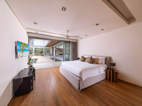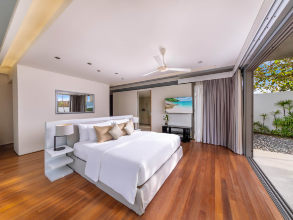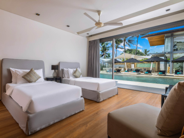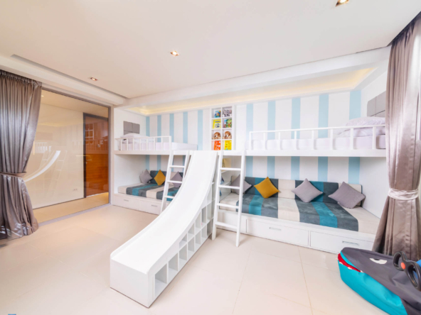 The villa features four guest bedrooms, one master suite, and a kid’s room with bunk beds. Each room is equipped with ensuite bathrooms, with two bedrooms facing the ocean. Additional thoughtful touches include bathrobes, TVs, a mini-library, a PS4 with games, children’s toys, and stylish furniture for a touch of luxury.