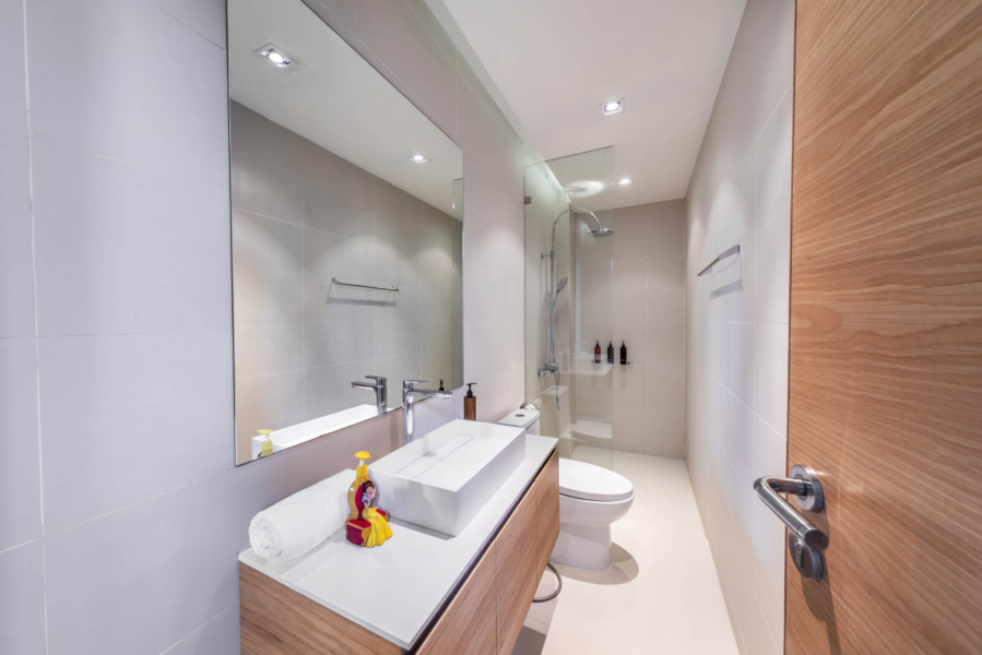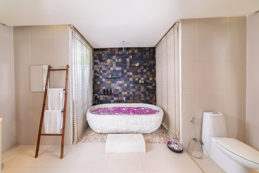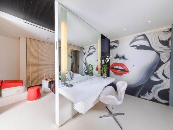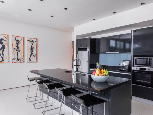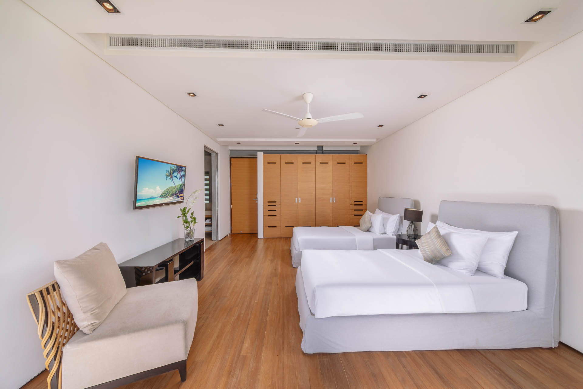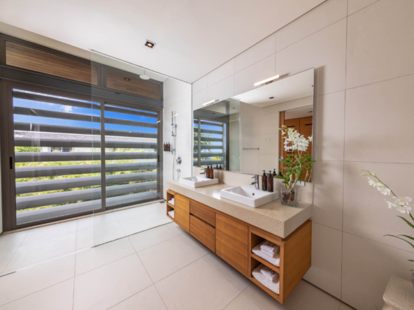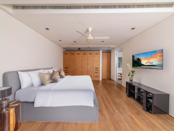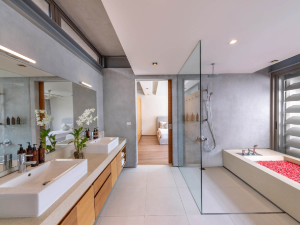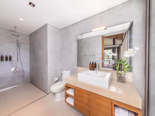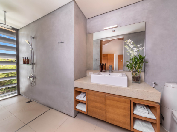 The villa features four guest bedrooms, one master suite, and a kid’s room with bunk beds. Each room is equipped with ensuite bathrooms, with two bedrooms facing the ocean. Additional thoughtful touches include bathrobes, TVs, a mini-library, a PS4 with games, children’s toys, and stylish furniture for a touch of luxury.