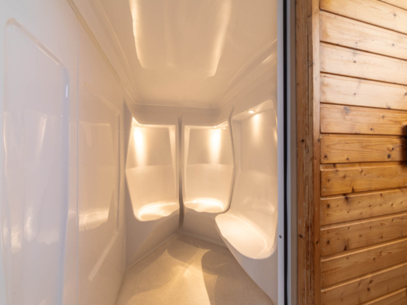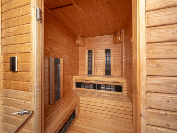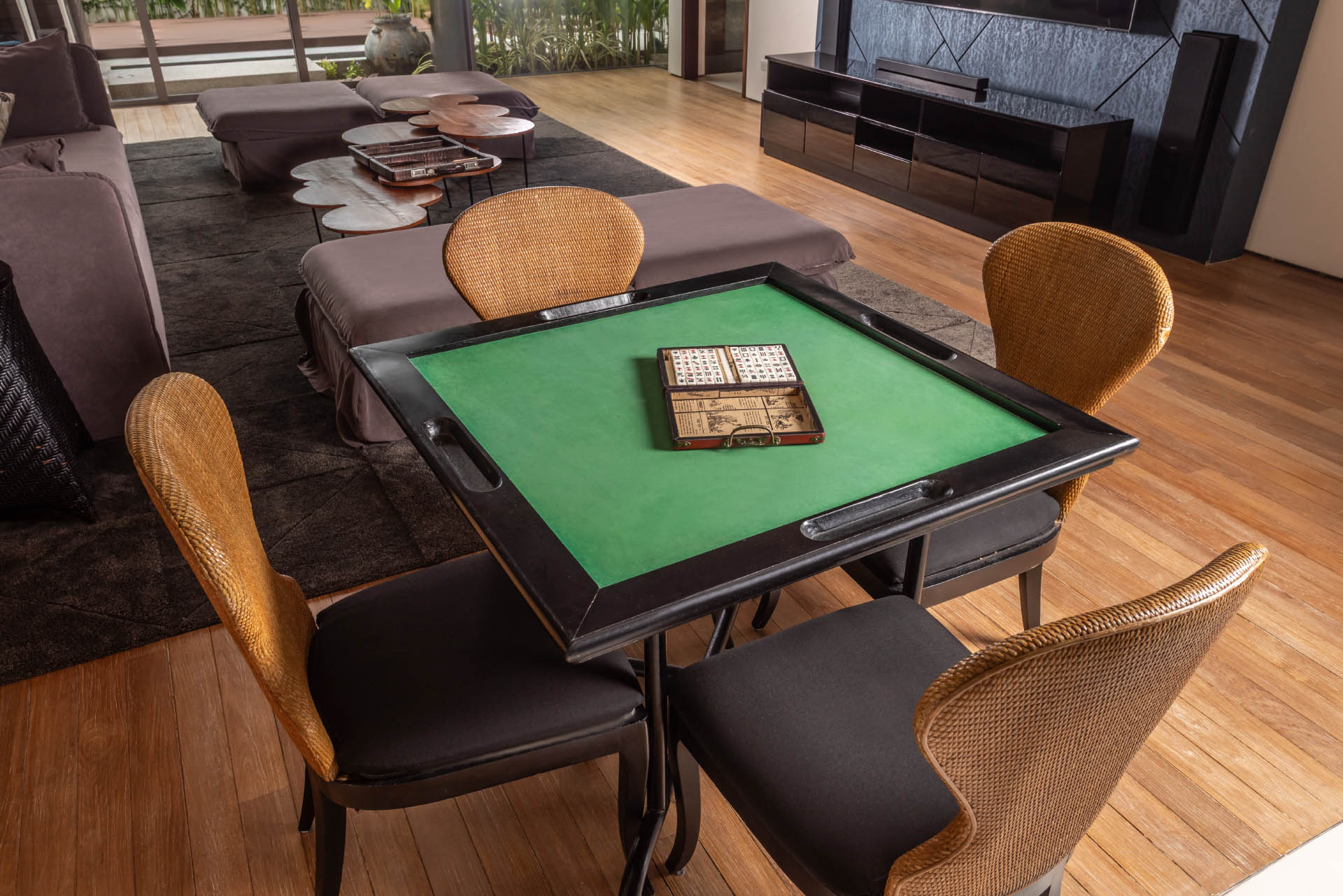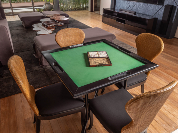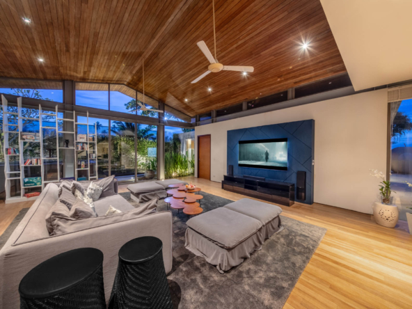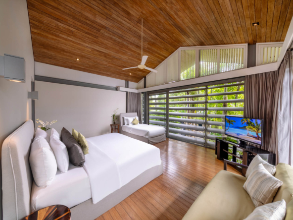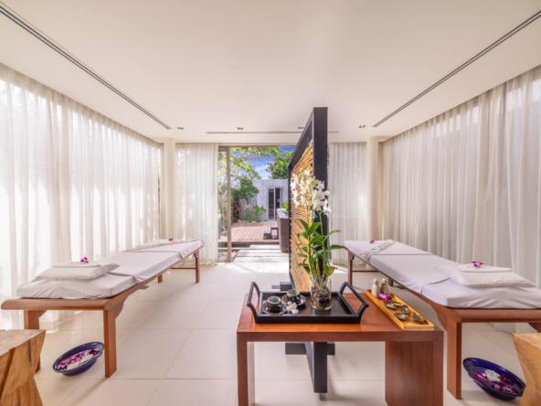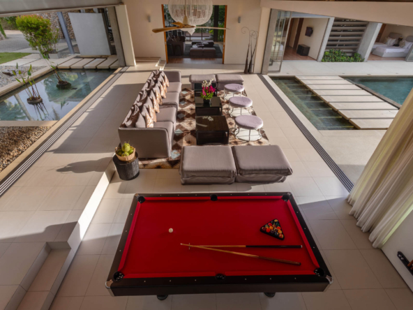 The expansive open-plan living area is the epitome of comfort, The villa also boasts a private spa complete with massage tables. For entertainment, there’s a pool table, a Smart TV with streaming services, and complimentary wireless Internet to keep guests connected during their stay. Adventurous guests are also welcome to use the kayaks, paddleboards, and bicycles available to explore the surrounding natural beauty.